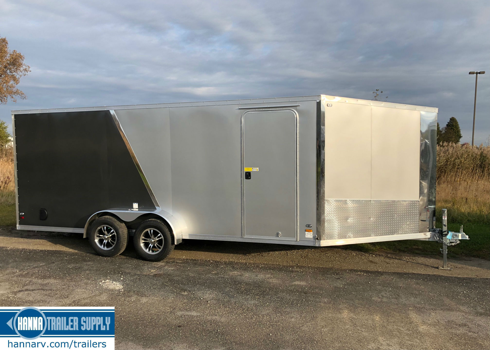 Built on a flat trailer chassis, the SnoPro Hybrid is a fully-enclosed unit with .030” exterior skin and a rear ramp door. Built with a tapered nose, front access door, and styled after SnoPro's signature cap design, the Hybrid is aerodynamic, extremely lightweight and versatile. Hanna Trailer has stocked and sold these top-of-the-line trailers for many years.