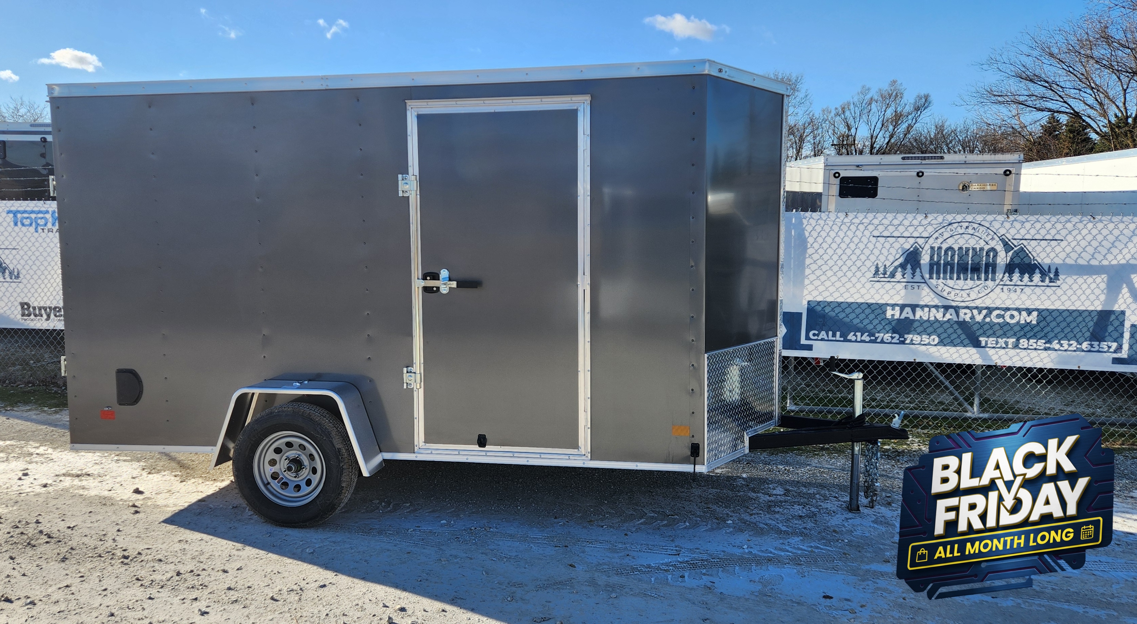 Hanna RV carries and creates enclosed steel cargo trailers in southern Wisconsin. We create custom stainless steel trailers for cars and trucks and offer MTI's dependable 6x12 models. Our 6-foot steel enclosed trailers come with various wall heights and ramp extensions to make your job easier. Call us at 414-762-7950 to discuss prices and options, or buy one of our standard models above. If you’d prefer a more rust-resistant trailer, browse our selection of aluminum utility trailers.
