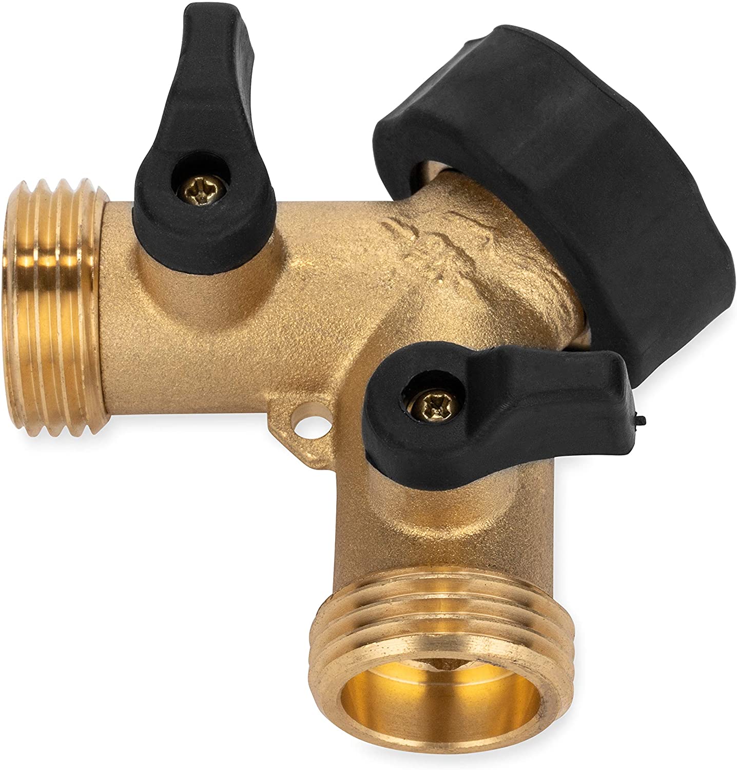 The Camco 20123 Brass Y-Valve Shutoff Valve is a solid brass housing with non-corrosive stainless steel quarter-turn pressure seated shut-off valves. It features easy-grip valve handles and a hose connection.