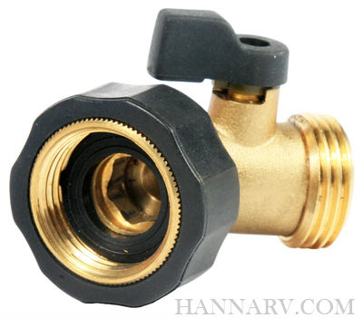 This Camco 20173 Brass 45 Degree Water Shut-Off Valve features a solid brass housing with non-corrosive stainless steel quarter-turn pressure seated shut-off valves. It has easy-grip valve handles and a hose connection.