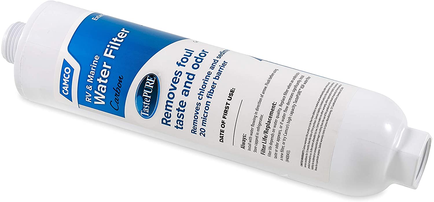 The Camco 40645 TastePure Carbon RV Water Filter Replacement Cartridge works for up to 120 days, removing chlorine and sediment from your RV's fresh water supply. The activated charcoal filters out contaminates to improve the smell and taste of your drinking water. This rv water filter also works with garden hose fittings. RV and marine approved.