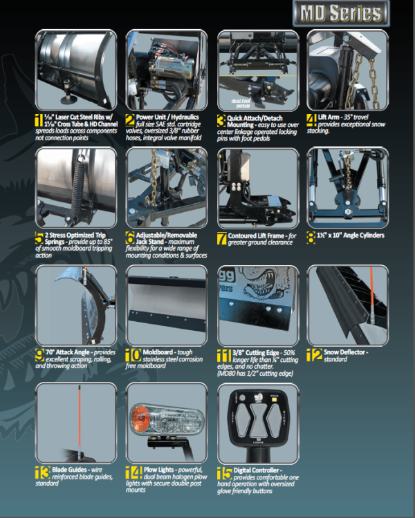 MD80- This is a medium duty plow with all of the same toughness of the EX Plows but at half of the weight. This plow fits most trucks without OEM plow prep packages and lighter duty trucks and suv's. Homeowners, small business owners and light commerical users in Milwaukee and Chicago can benefit from the toughness and adaptability of a SnowDogg MD Plow