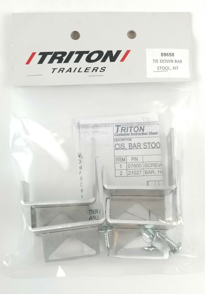 The Triton 09650 Tie Down Bar Holder Kit, also called a "Bar Stool Kit", comes with 2 pairs of brackets that will hold 2 tie down bars on the walls while you move your sleds on and off. No more tie down bars to stumble over on the deck. The bottom part of the bracket can be used as a coat hanger too.  Easy to mount kit includes 4 brackets total with mounting hardware.