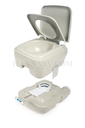 The Camco 41531 Portable 2.6 Gallon Toilet is compact and lightweight. The holding tank is detachable for easy emptying. It features a leak-proof design with locking lid to prevent spills. The sealing slide valve allows easy flushing and locks in odors. It features a bellow-type flush. It has sturdy construction with durable parts.