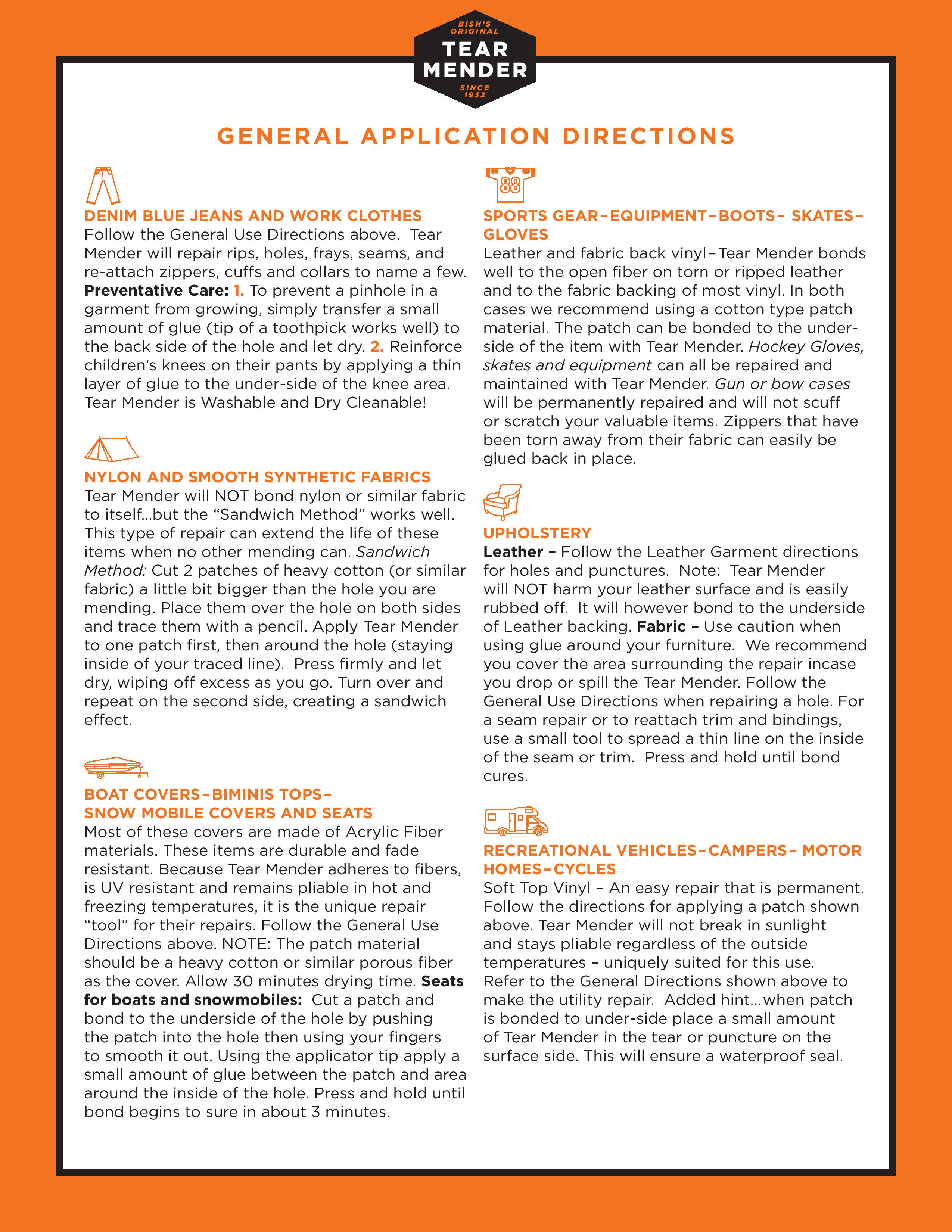 Most of these covers are made of Acrylic Fiber materials. These items are durable and fade resistant. Because Tear Mender adheres to fibers, is UV resistant and remains pliable in hot and freezing temperatures, it is the unique repair “tool” for their repairs. Follow the General Use Directions above. NOTE: The patch material should be a heavy cotton or similar porous fiber as the cover. Allow 30 minutes drying time. Seats for boats and snowmobiles: Cut a patch and bond to the underside of the hole by pushing the patch into the hole then using your fingers to smooth it out. Using the applicator tip apply a small amount of glue between the patch and area around the inside of the hole. Press and hold until bond begins to sure in about 3 minutes.