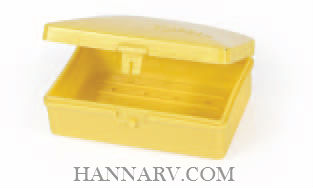 The Camco Mfg 51356 Soap Holder is a covered soap dish with a securely snapping lid closure and vent holes in the bottom.