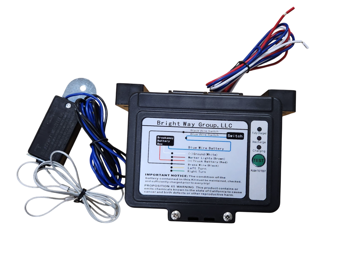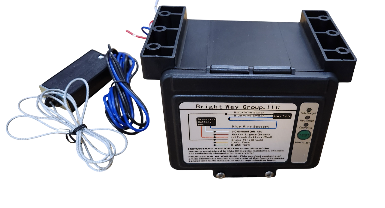 This kit contains everything you need in a breakaway kit. It includes the breakaway switch, battery, box with LED charge indicator, charger, and mounting hardware. Some replacement parts are available if needed.