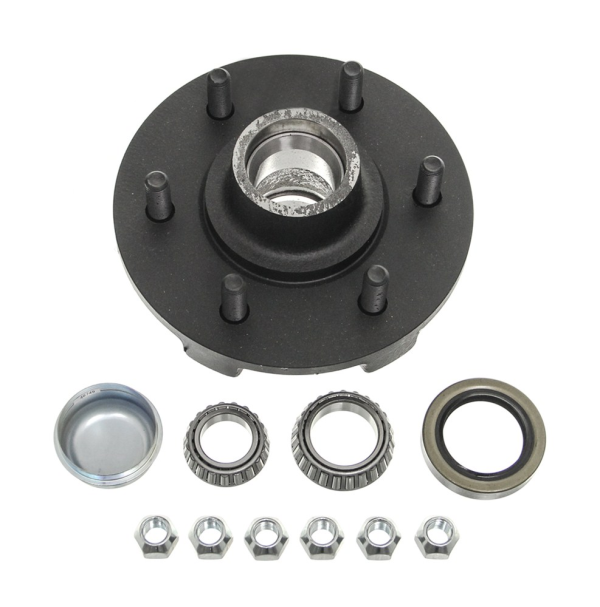 Hub is designed for use on trailer idler axles. Fits 3,500-lb axles with #84 spindles. Inner bearing (L68149) and race, outer bearing (L44649) and race, grease seal, grease cap, wheel bolts, and lug nuts included. Spindle nut and spindle washer sold separately.
