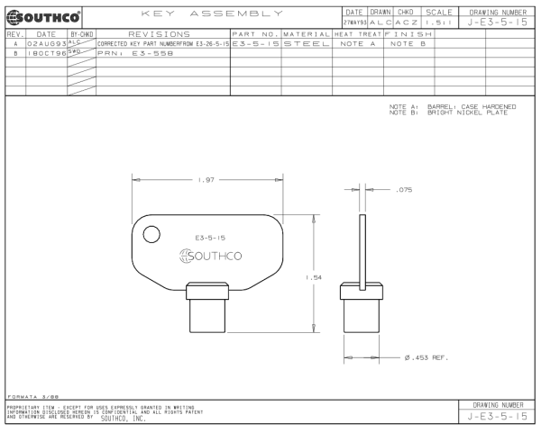 The old part number is E3-26-715-15, and the current part number is Southco E3-5-15. Some older keys may have a different head style.