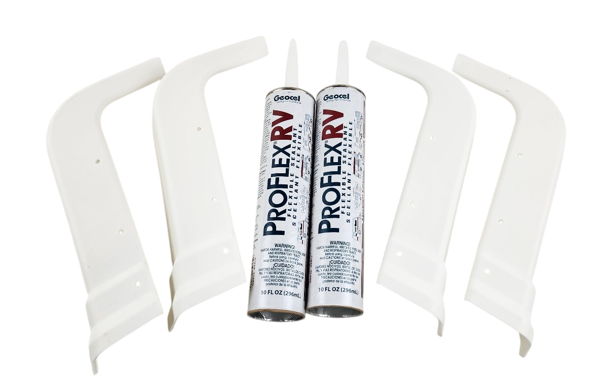This listing is for a set of 4 plastic replacement roof corner caps for pop up tent campers as well as two 10 oz tubes of Clear Proflex Sealant. You can apply the included sealant to the corners of your camper before you mount your new caps for a durable, waterproof finish.