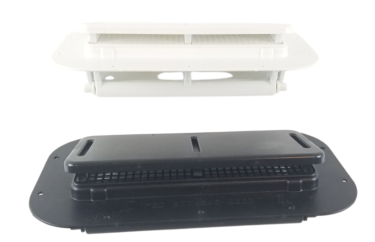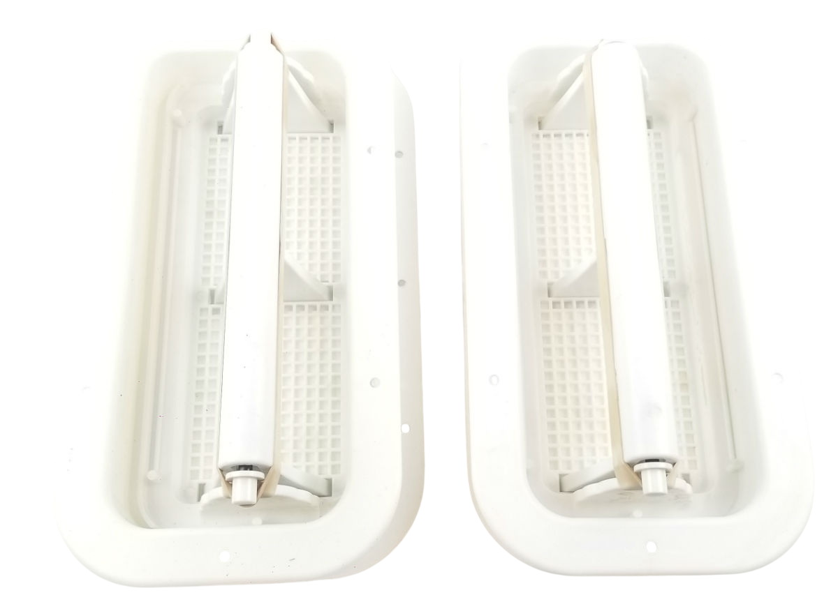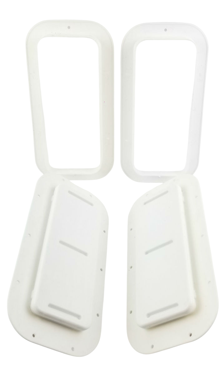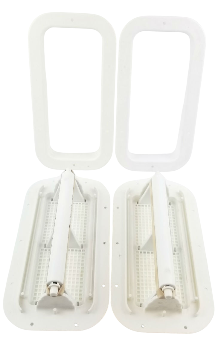 This listing is for one pair of White Molded Plastic Two-Way Trailer / RV Vents with Trim Rings. These vents are designed to be mounted on the sidewalls of trailers.