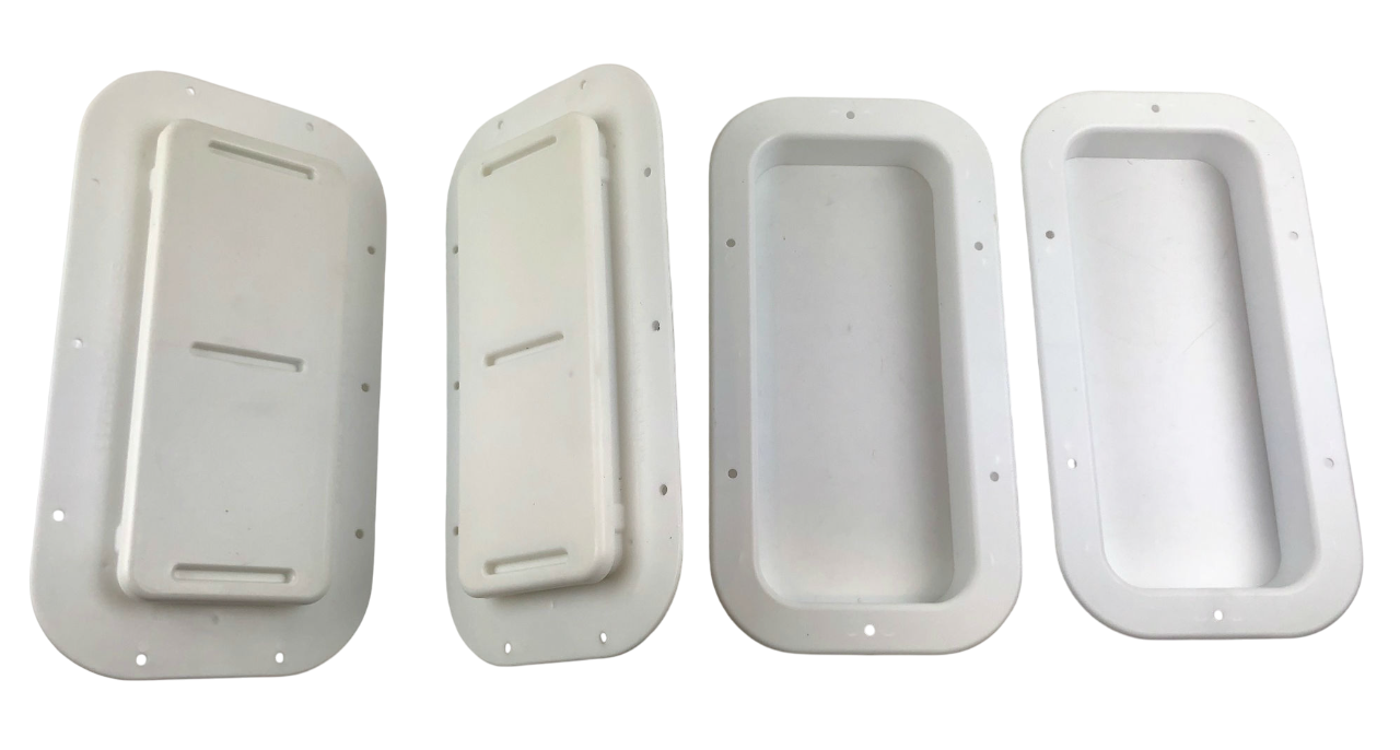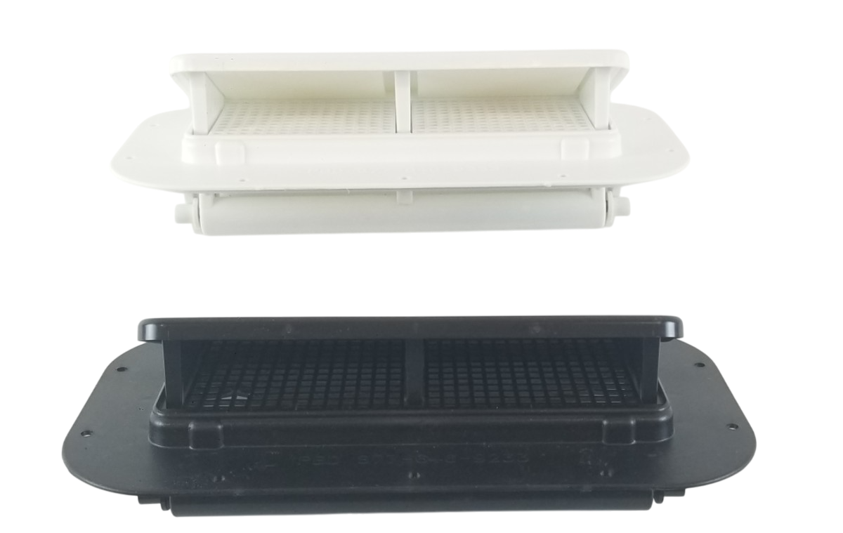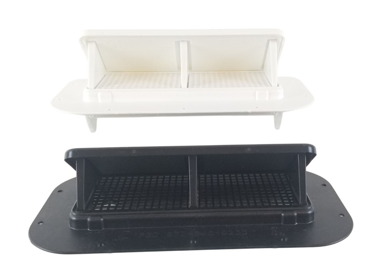 This listing is for one pair of White Molded Plastic Two-Way Trailer / RV Vents with Trim Rings. These vents are designed to be mounted on the sidewalls of trailers.