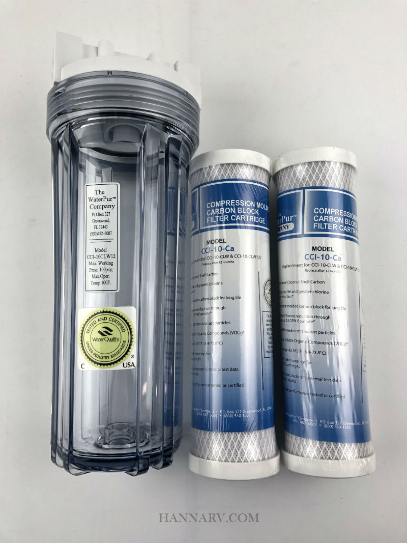 The Water Pur Company CCI-10CLW12 filter canister is a clear water filter housing. It is the replacement for the water filter canister used in Forest River RVs model year 2004 to 2014. Use this water filter housing with a Water Pur Company CCI-10-Ca replacement filter, which is designed to fit the Water Pur Company CCI-10CLW12 filter housing.