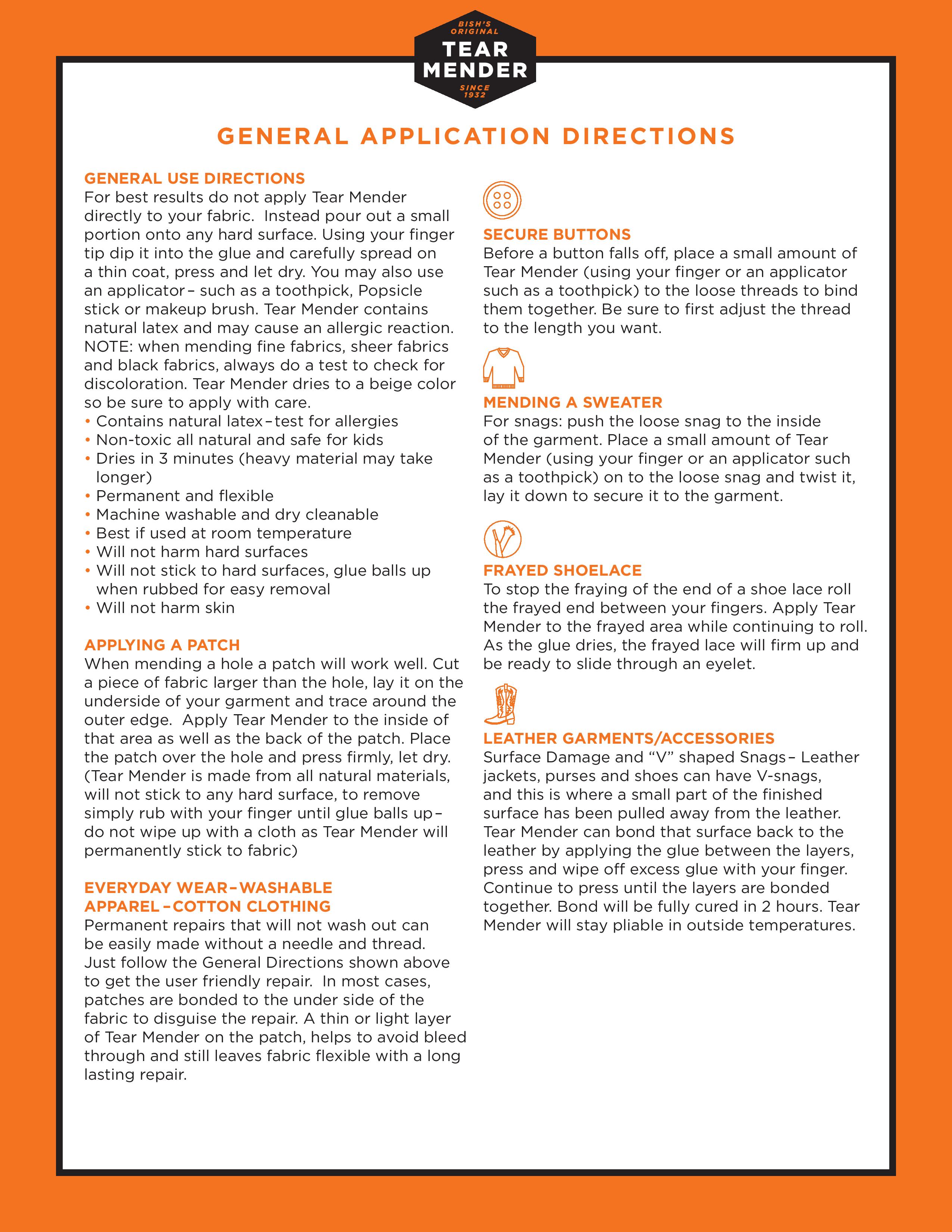 For best results do not apply Tear Mender directly to your fabric. Instead pour out a small portion onto any hard surface. Using your finger tip dip it into the glue and carefully spread on a thin coat, press and let dry. You may also use an applicator– such as a toothpick, Popsicle stick or makeup brush. Tear Mender contains natural latex and may cause an allergic reaction. NOTE: when mending fine fabrics, sheer fabrics and black fabrics, always do a test to check for discoloration. Tear Mender dries to a beige color so be sure to apply with care.