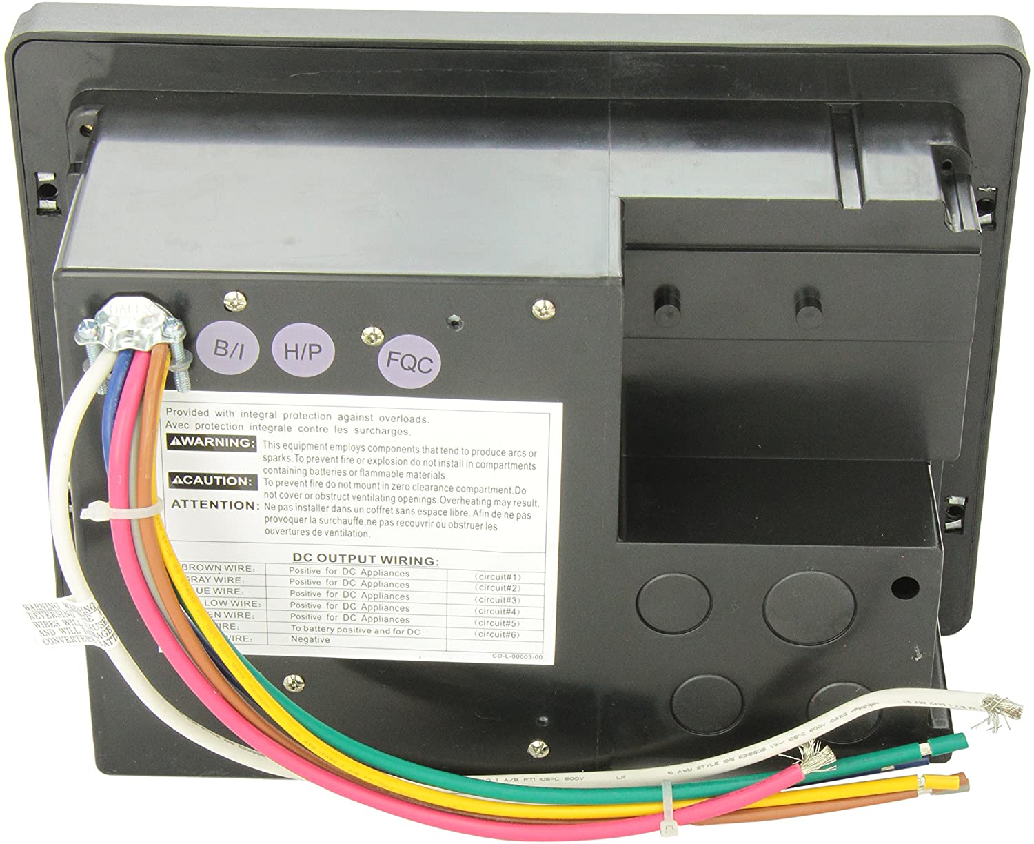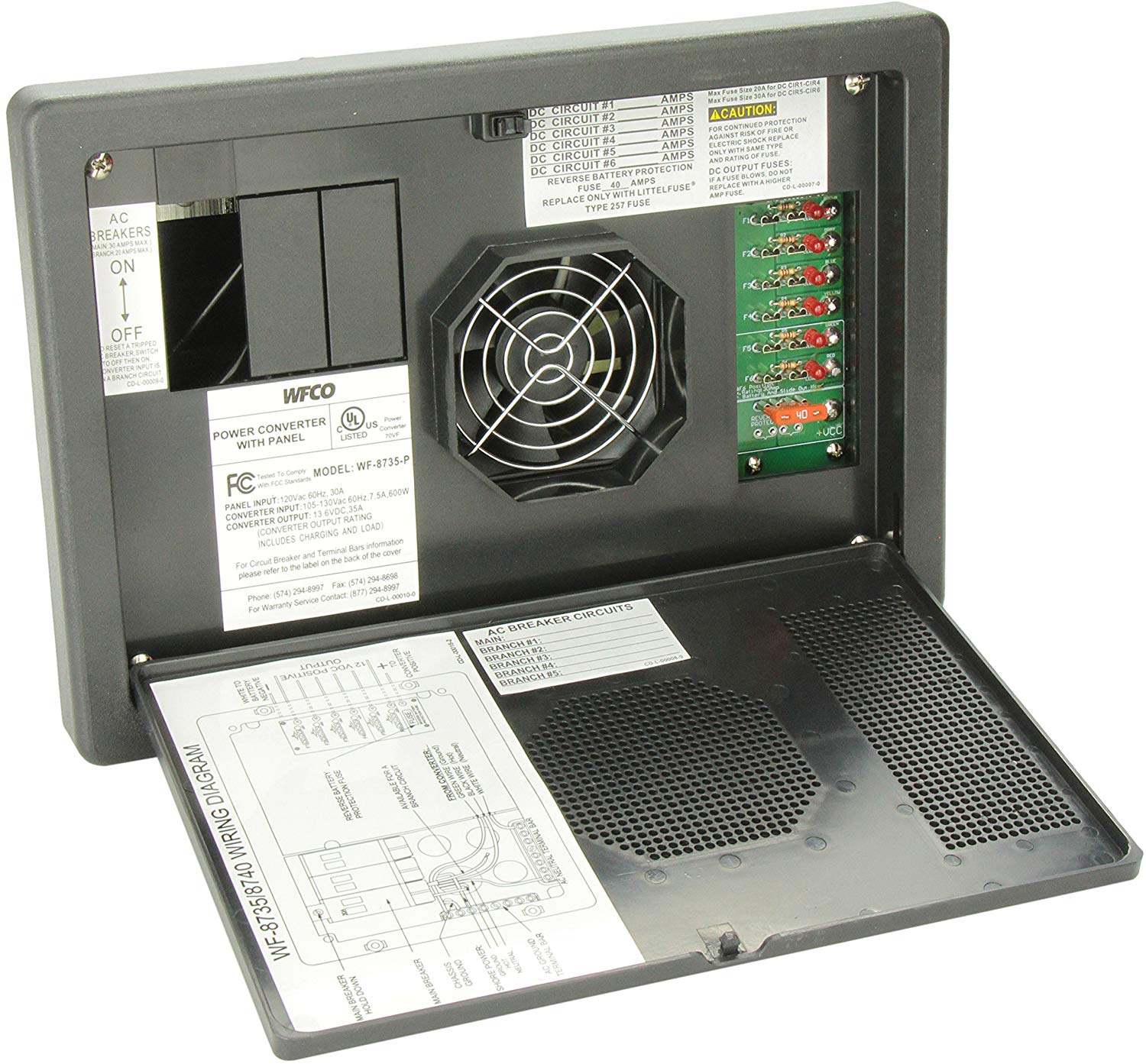 WF-8735 model converters provide 35 Amp DC output, and a highly reliable nominal 13.6 VDC with or without a battery. No extra filtering is required. WFCO’s three-stage battery charging results in longer battery life and is totally automatic. Nominal voltage output modes are a 13.2 VDC range “float” mode, 13.6 VDC range “absorption” charge mode, and a 14.4 VDC range “bulk” charge mode. Short-circuit and reverse polarity protection provide you with further reliability and peace of mind. The cooling fan for the WF-8735 operates only when needed and ensures quiet operation. Front-cooled fan installation does not create additional installation space requirements. Every model is designed to comply FCC Class B, which means that the converters do not cause interference with televisions, radios, or other signals. The 8735 model also brings you the convenience of built-in AC/DC distribution. 30 Amp main AC breaker and a total of up to five 20 Amp branch AC circuits can be installed. Six DC branch circuits include LED bulbs that illuminate to indicate open circuits.
