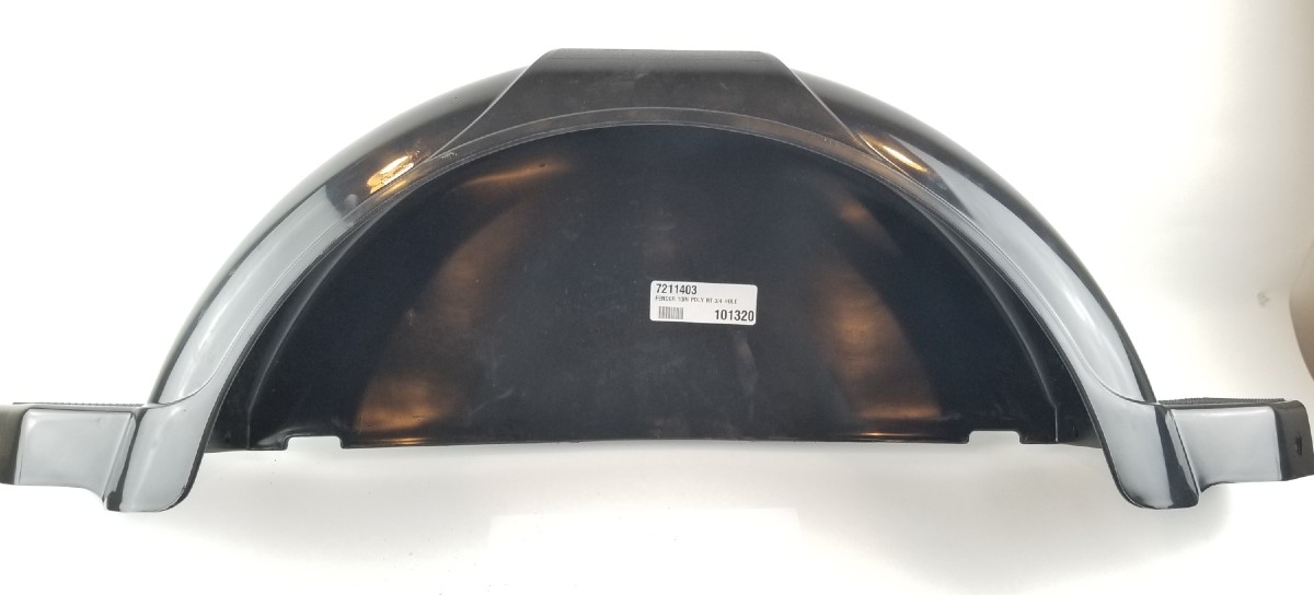 The Shorelander 7211403 Right Side Black Poly Trailer Fender is made to mount on the passenger's side of your Shorelander trailer. It is made for 14" tires, and has a small circular cutout on the front end for mounting a clearance light which measures 3/4".