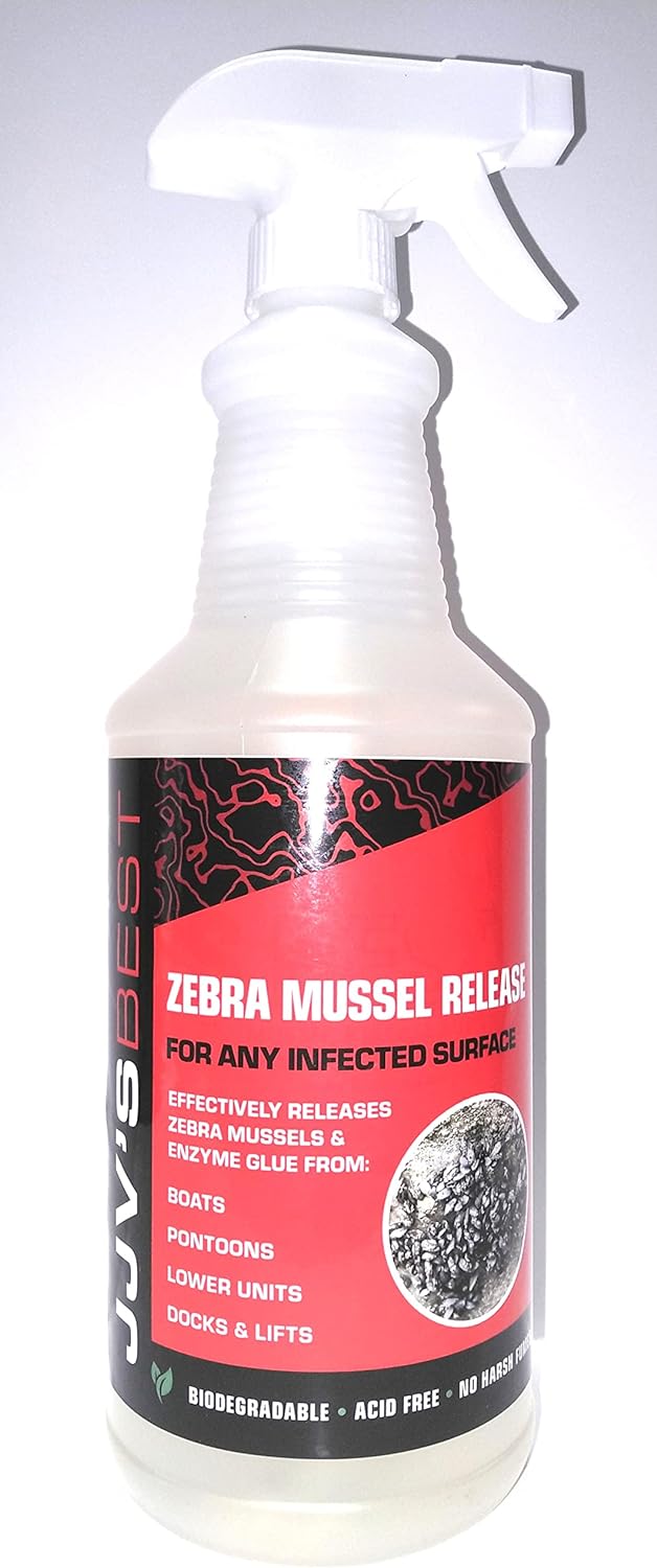 JJV's Best ZEB100 Zebra Mussel Release Agent safely and effectively cleans zebra mussels and the enzyme glue from your boat, outdrive, docks, lifts and propellers.