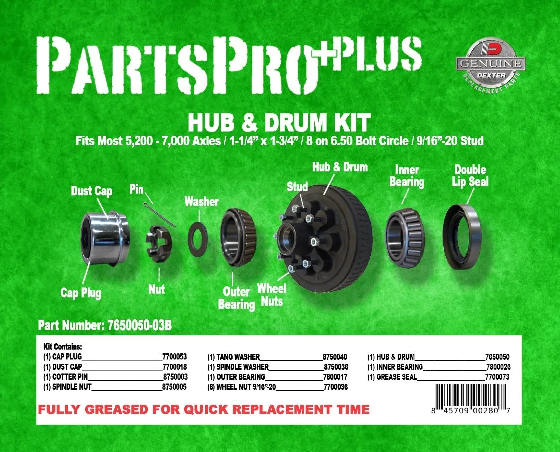 This listing is for one Pregreased Hub & Drum Kit for 6000 to 7000 Lb Axles with a 8 on 6.5 bolt pattern and a 1-1/4 x 1-3/4" diameter #42 spindle.