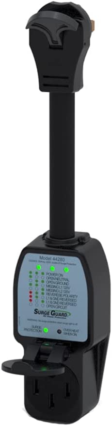 The SouthWire Corp. 44280 30 Amp 120 Volt Portable Surge Protector Identifies faulty park power along with industry leading surge protection. Plug into power pedestal to test for and indicate open ground, open neutral or correct polarity. Indicators illuminate to show power status. Also includes a surge status and temperature sensor indicator LED.