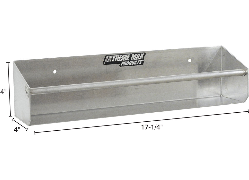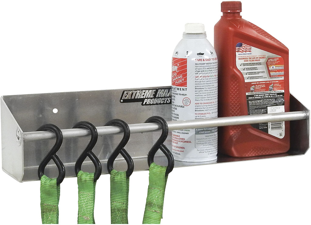 Extreme Max's Aluminum Shelving and Storage Rack is designed for installation in a garage, workshop, or enclosed trailer, providing an excellent shelf for storing aerosol cans and quart-sized jugs, and a hanger for storing tie down straps, clothes hangers, and other items. The holder features a heavy-duty aluminum construction with a clean, attractive finish, adding an eye-catching design that accents nearly any shop, garage, or enclosed trailer. The rack contains pre-drilled mounting screw holes for ease of installation. Due to the variety of surfaces to which the rack may be mounted, mounting hardware is not included.