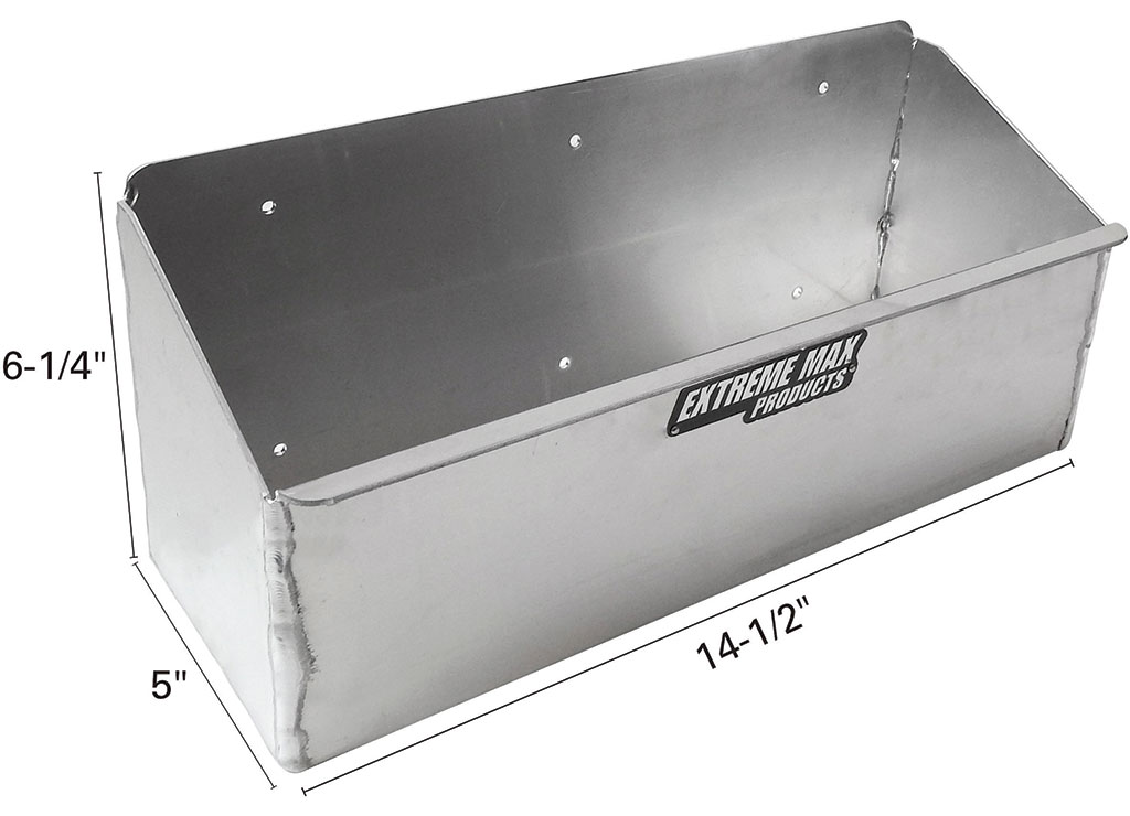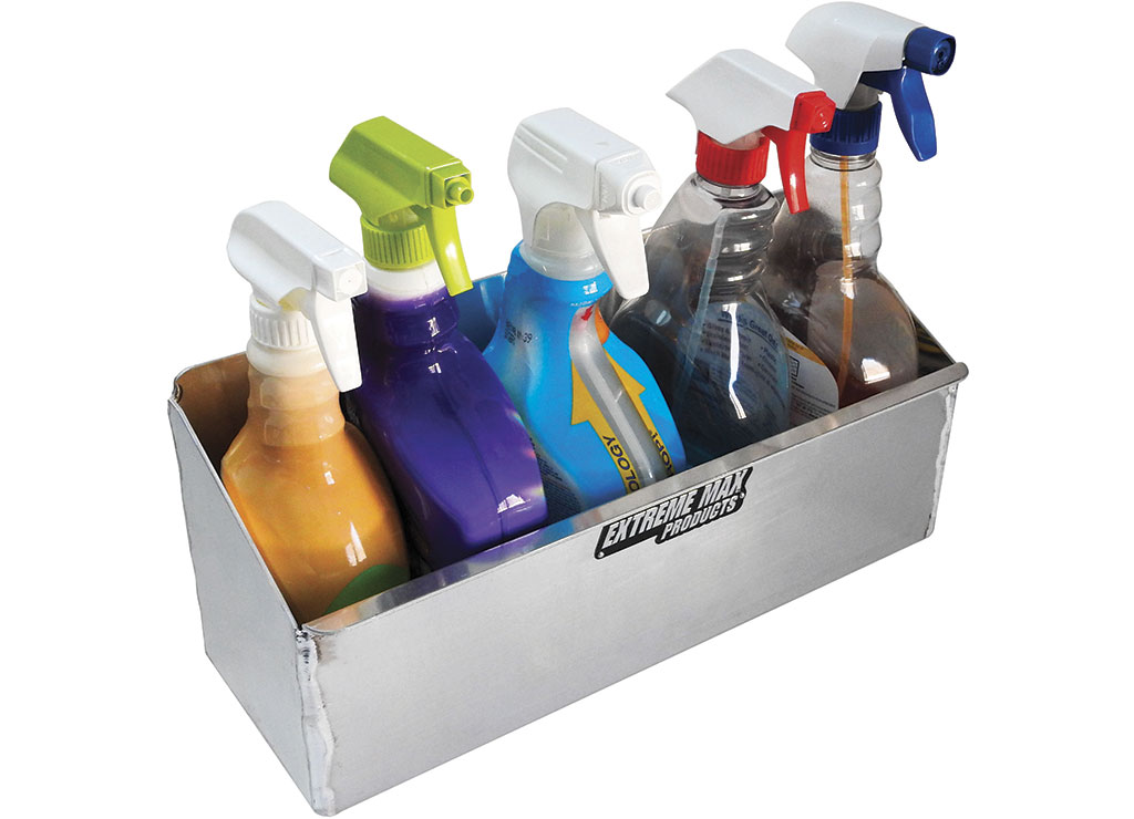 Store your spray bottles securely within your enclosed trailer or garage with the Extreme Max Aluminum Spray Bottle Shelf. The shelf holds four one-quart liquid containers, or a combination of cleaners, tools, rags, or other supplies requiring a safe storage place. The open-top shelf contains lower cut sidewalls that allow easy access to the shelf's contents, but are tall enough to securely hold the stored materials. The shelf features a lightweight aluminum construction with a clean, attractive finish, adding an eye-catching design that accents nearly any shop, garage, or enclosed trailer. The shelf contains pre-drilled mounting screw holes for ease of installation. Due to the variety of surfaces to which the shelf may be mounted, mounting hardware is not included. Usable Interior Dimensions: 4-7/8" (Depth) x 14-1/8" (Width).