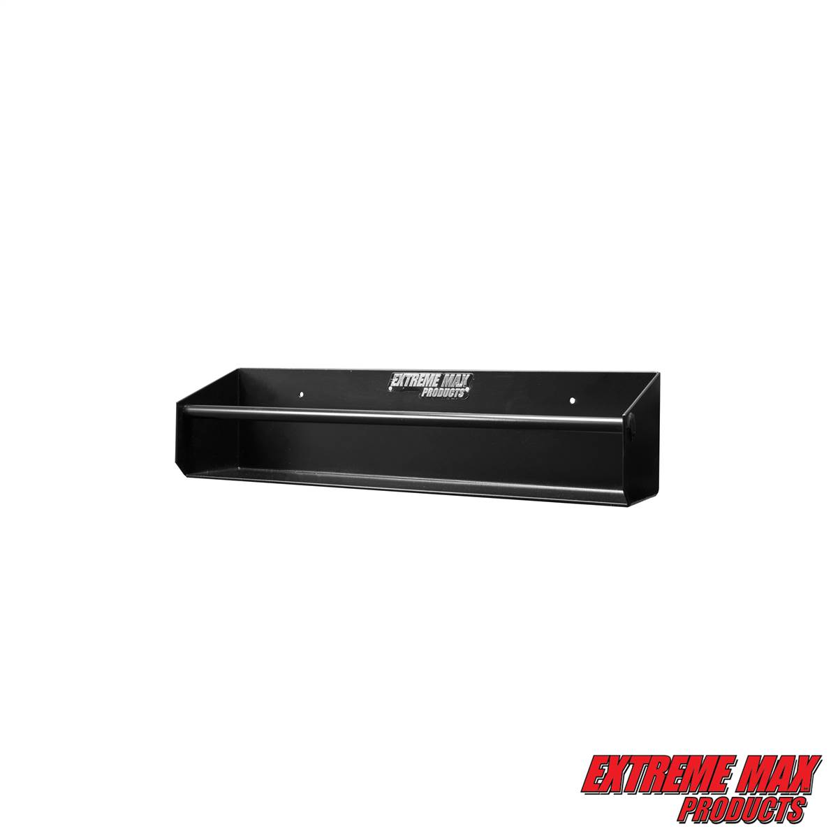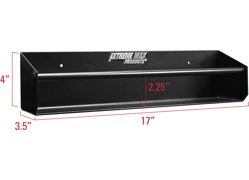 Extreme Max's Aluminum Shelving and Storage Rack is designed for installation in a garage, workshop, or enclosed trailer, providing an excellent shelf for storing aerosol cans and quart-sized jugs, and a hanger for storing tie down straps, clothes hangers, and other items. The holder features a heavy-duty aluminum construction with a sleek black powder coat finish, adding an eye-catching design that accents nearly any shop, garage, or enclosed trailer. The rack contains pre-drilled mounting screw holes for ease of installation. Due to the variety of surfaces to which the rack may be mounted, mounting hardware is not included.
