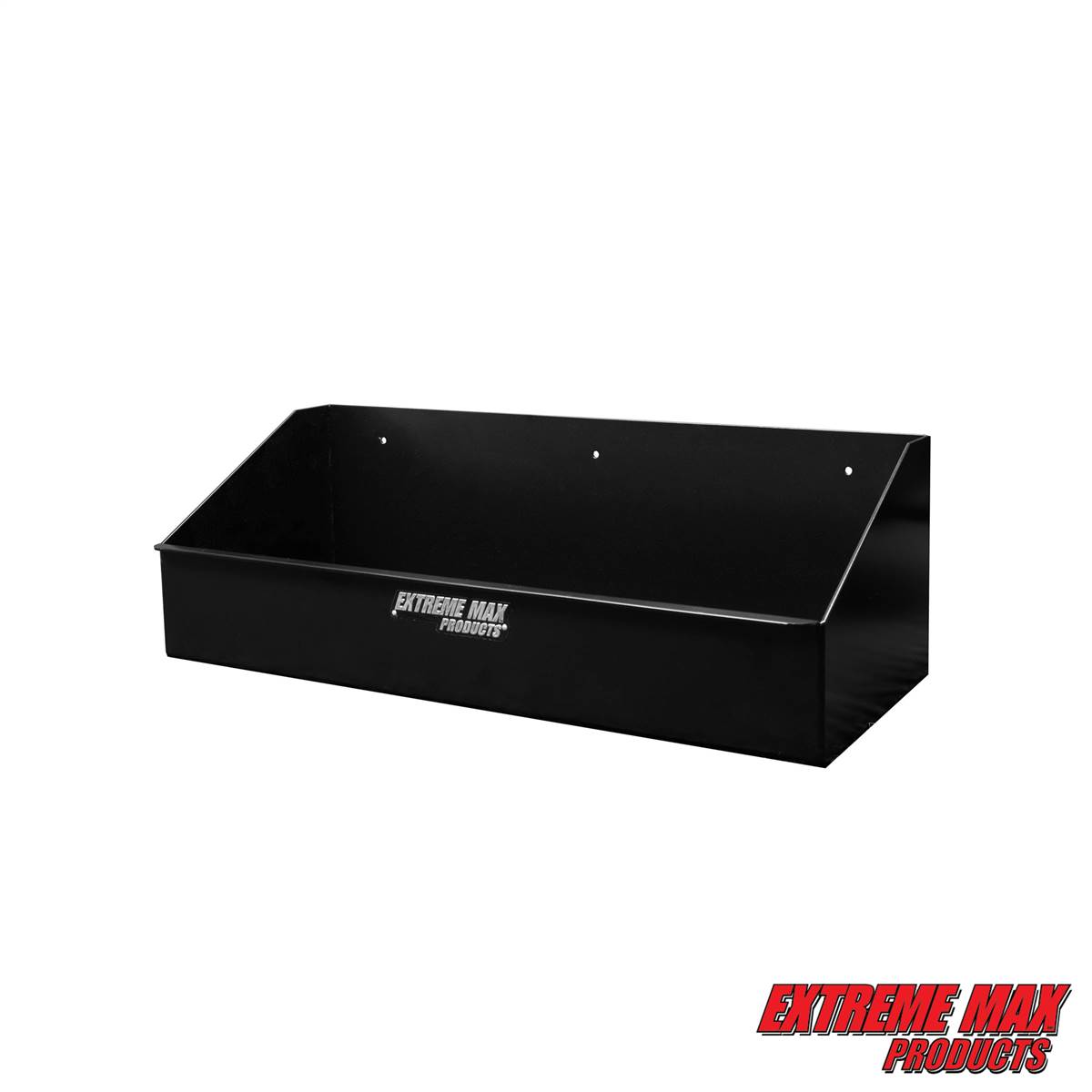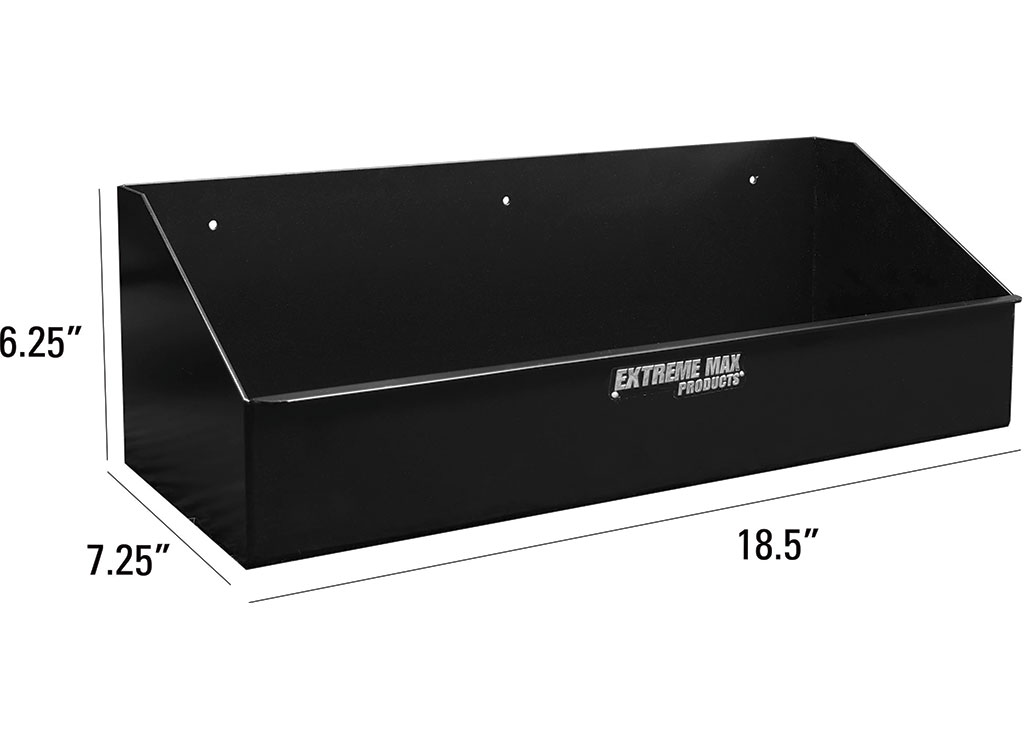 Store your quart-sized liquid containers securely within your enclosed trailer or garage with the Extreme Max Aluminum Liquid Storage Shelf. The shelf holds four one-quart jugs, or a combination of cleaners, tools, rags, or other supplies requiring a safe storage place. The open-top shelf contains lower cut sidewalls that allow easy access to the shelf's contents, but are tall enough to securely hold the stored materials. The shelf features a lightweight aluminum construction with a sleek black powder coat finish, adding an eye-catching design that accents nearly any shop, garage, or enclosed trailer. The shelf contains pre-drilled mounting screw holes for ease of installation. Due to the variety of surfaces to which the shelf may be mounted, mounting hardware is not included.
