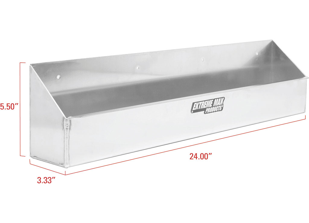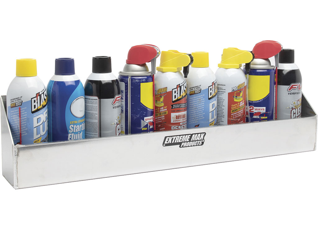 Store your aerosol cans securely within your enclosed trailer or garage with the Extreme Max Aluminum Aerosol Storage Shelf. The shelf holds eight standard 12 oz. to 16 oz. aerosol cans. The open cut-out top design keeps your aerosol cans organized and separated from each other. The shelf features a lightweight aluminum construction with a clean, attractive finish, adding an eye-catching design that accents nearly any shop, garage, or enclosed trailer. The shelf contains pre-drilled mounting screw holes for ease of installation. Due to the variety of surfaces to which the shelf may be mounted, mounting hardware is not included.