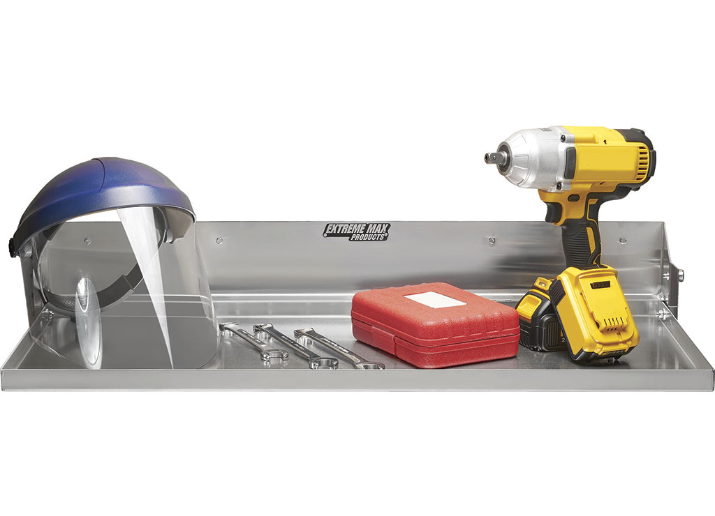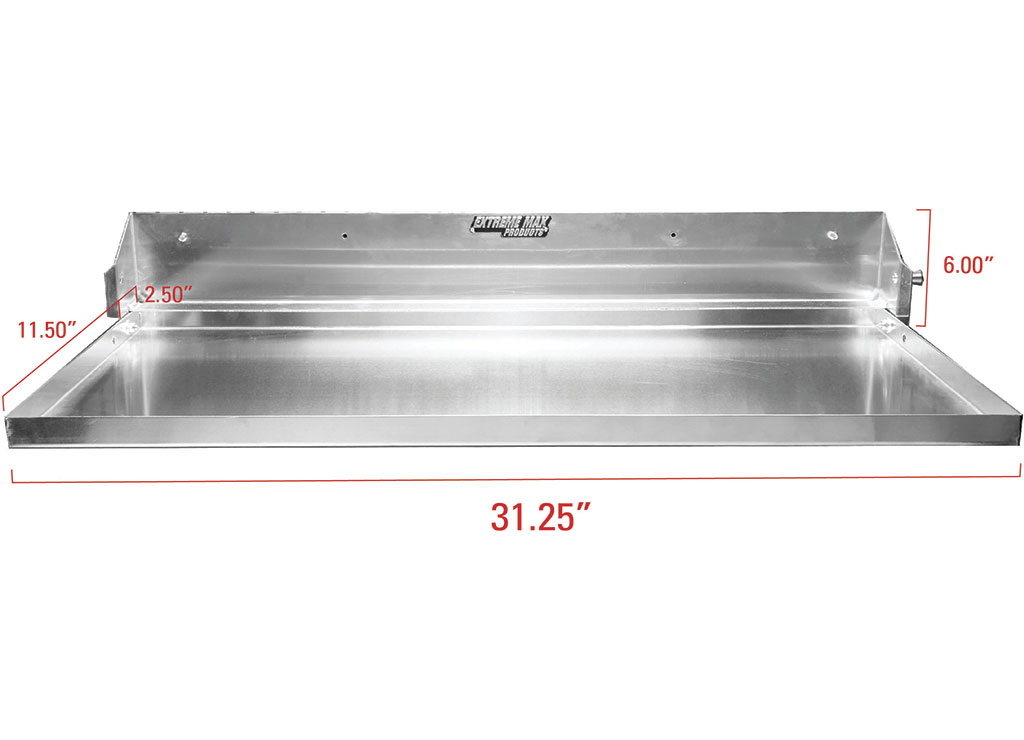 Extreme Max's Fold-Down Aluminum Work Station is the perfect workspace addition to any garage or enclosed race trailer! The flip-down design saves valuable interior space, but folds down to create a 14" x 32" work station. The work station locks into the raised position when not in use. The cabinet features a lightweight aluminum construction with a clean, attractive finish, adding an eye-catching design. The cabinet contains pre-drilled mounting screw holes for ease of installation. Due to the variety of surfaces to which the cabinet may be mounted, mounting hardware is not included.