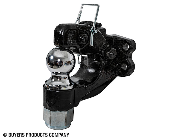 Haul it your way with the Buyers Products 15 Ton Bolt-On Combination Hitch. The patented design combines a ball hitch and a pintle hook into a single versatile piece of equipment. This makes it easy to pull loads up to 24,000 lb with either a coupler or drawbar/pintle ring without needing to change hitches. Ideal for tradesman, contractors, and haulers who tow a range of loads. Heavy duty forged steel construction features a corrosion resistant black powder-coated finish. A spring-loaded locking arm provides secure coupling. The unit includes a 2-5/16 in. chrome-plated ball, but it can accommodate other ball sizes as well. A drilling template is included.