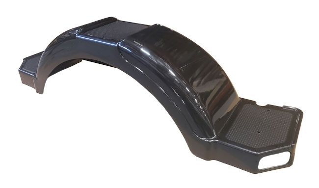 KARAVAN high impact black polycarbonate plastic two step fender with side marker light cutout in the front. Fits single axle trailers with 14" or 15" trailer tires. Mounting brackets and hardware not included.