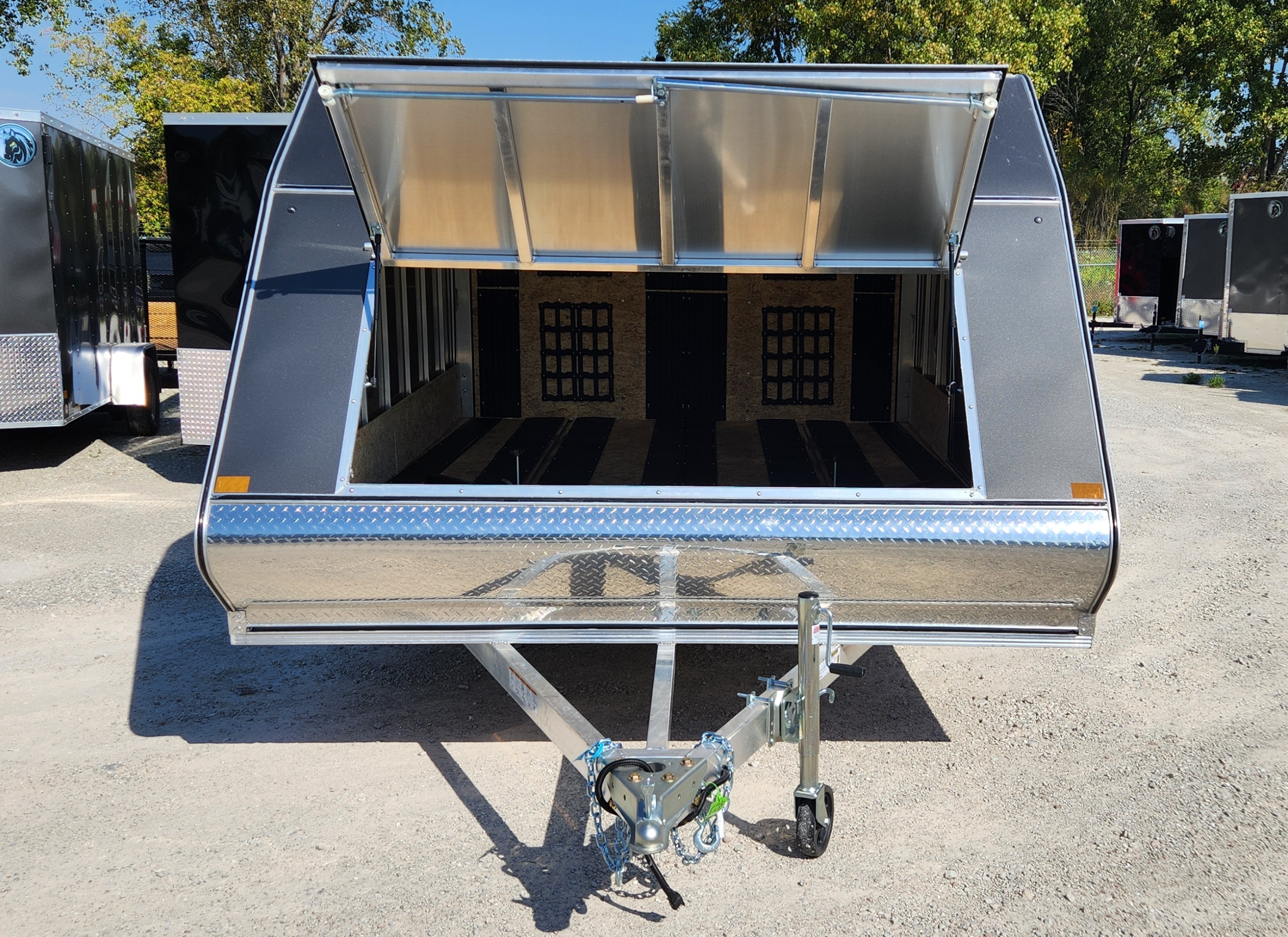 Built on a flat trailer chassis, the SnoPro Hybrid is a fully-enclosed unit with .030” exterior skin and a rear ramp door. Built with a tapered-nose, front access door, and styled after SnoPro's signature cap design, the Hybrid is aerodynamic, extremely lightweight and versatile.