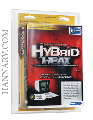 The Camco RV Hot Water Hybrid Heat 6 Gallon Kit converts a 6 gallon RV LP gas water heater to 120 Volt electricity on demand. Conserve propane by using electricity to heat your water. The heating cartridge is made of high-quality stainless steel to heat the water to temperatures ranging from 90 degrees to 150 degrees Fahrenheit. The kit includes an ON/OFF power switch with a mounting bracket and fully adjustable thermostat. All the necessary power cords and color-coded wire assemblies are included. It is factory preset to 120 degrees Fahrenheit.