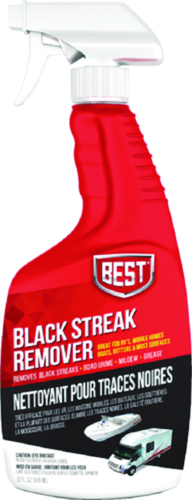 Best Products 50032 Black Streak Remover easily removes black streaks, tar and road grime build up on any RV or camper with minimal rubbing. This formula also works great for tires, white walls, wheels and gutters. It is safe for use on fiberglass, metal and painted surfaces when used as directed, and contains no acids or costics. It comes in a handy 32-oz. trigger spray bottle and won't harm or fade decals on your vehicle, RV, pop-up or trailer.