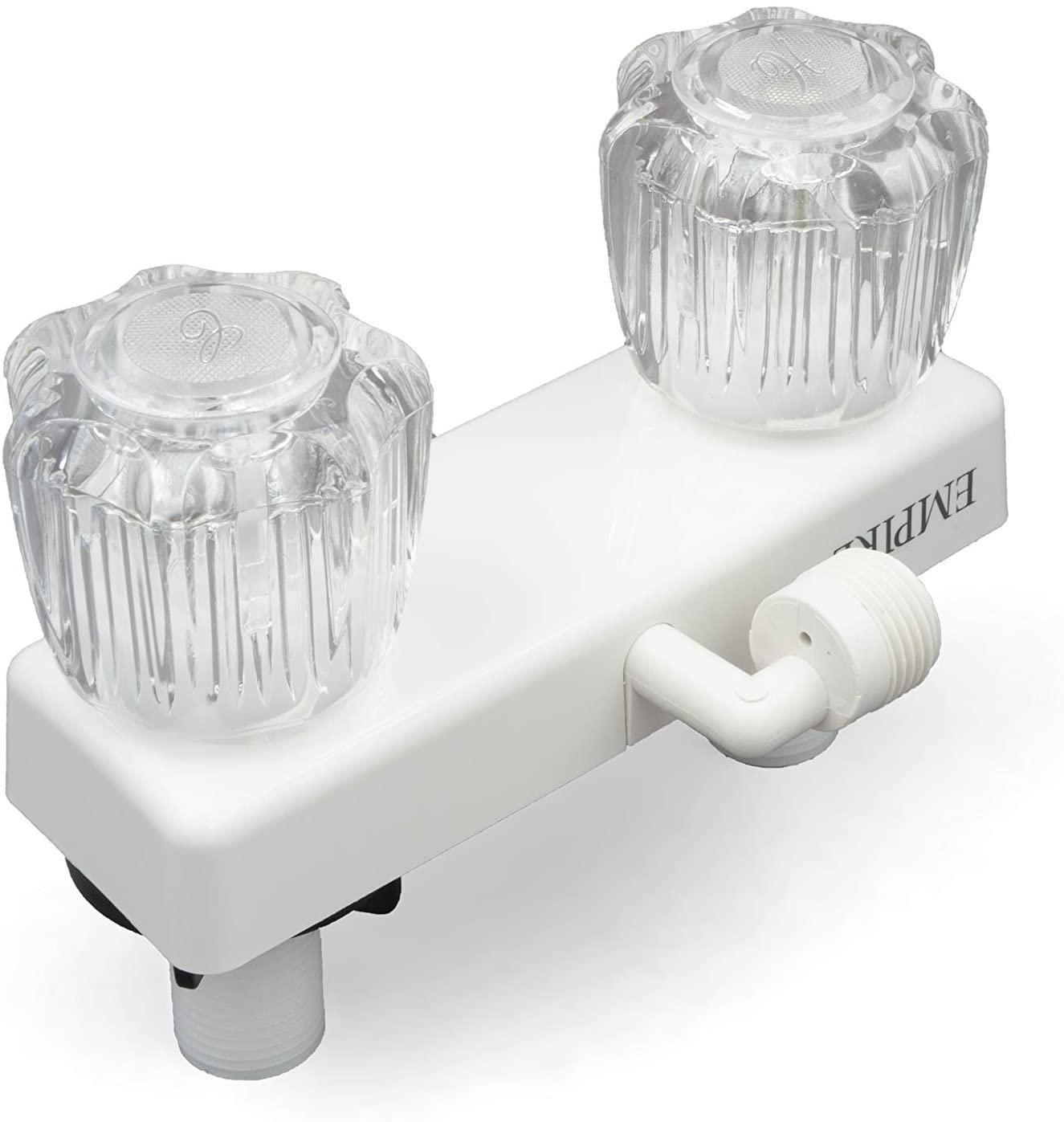 The Thetford 94203 Polar White Replacement Faucet for Exterior RV Shower features a unique 90° diverter valve and clear knobs.