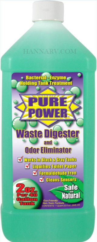 Organic Power Products' Pure Power 32 Oz Concentrated Holding Tank Waste Digester And Odor Eliminator has a super concentrated bacteriological formula. It uses only 2 oz. per treatment in both black & gray tanks! Let the natural efficiency of bacteria & enzymes keep your holding tanks clean and odor-free. Put the power of this proprietary microbial formula to work for you and see what a difference it makes. This chemical-free solution is accepted at all campgrounds, RV parks, and RV/Marine dump stations. It is safe to use in all septic systems. It will not harm children or pets. It has a fresh wintergreen fragrance.